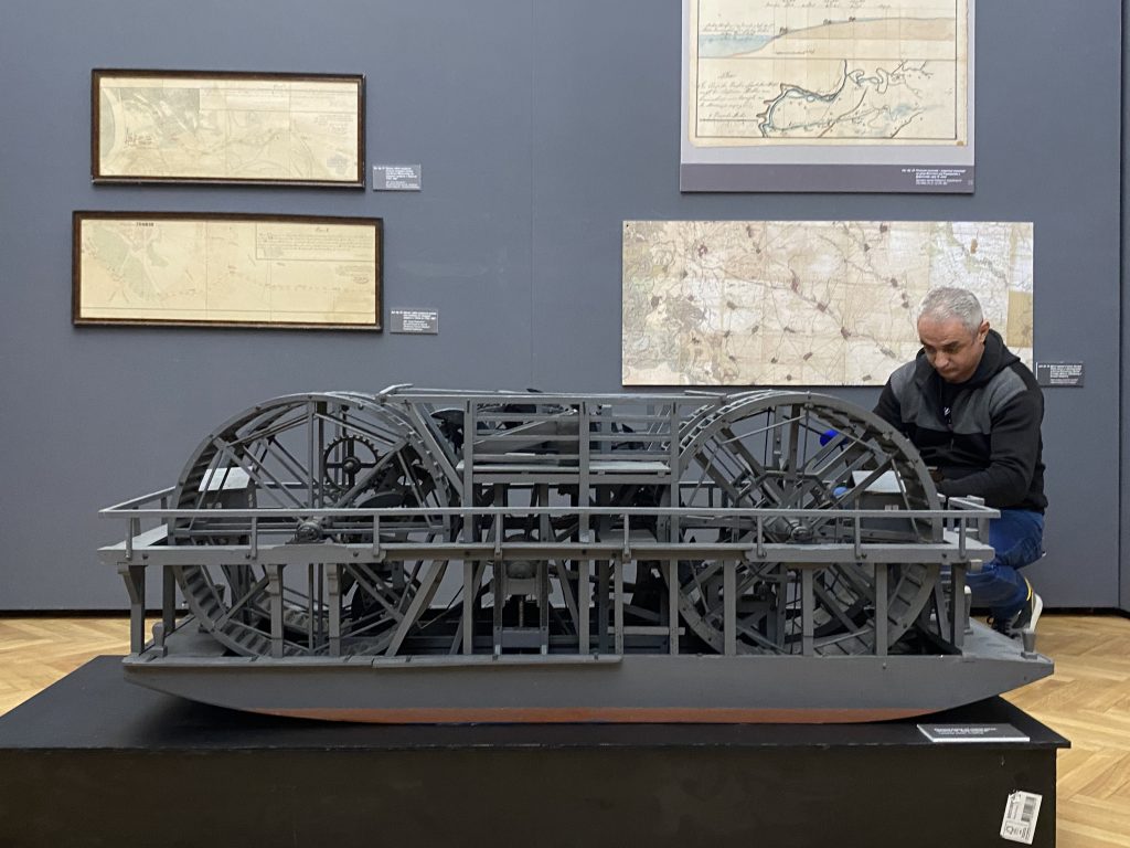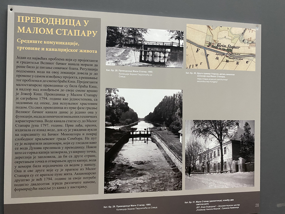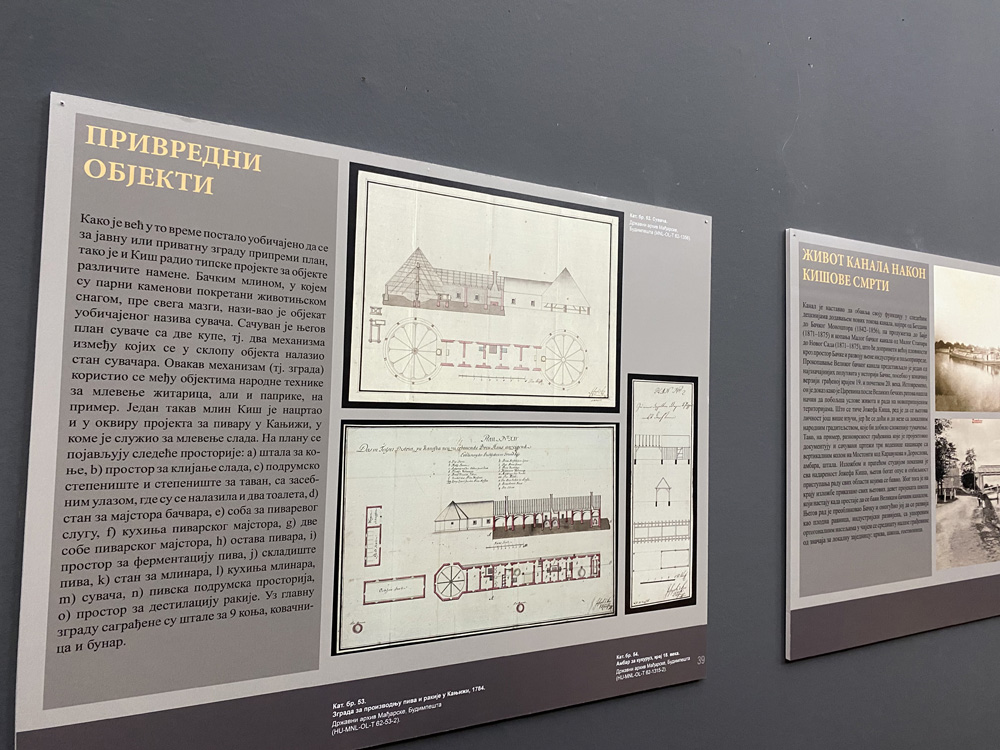 Na izložbi u Muzeju Vojvodine mogu se videti planovi (većina je pozajmljena iz Državnog arhiva Mađarske u Budimpešti) i artefakti u vlasništvu ustanova/kolekcionara – fotografije, dokumenti, razglednice. Deo postavke je i pozajmica iz Gradskog muzeja Sombor – maketa bagera na nožni pogon, koji je služio za čišćenje dna i održavanje kanala. Među eksponatima su brojne Kišove mape, njegovi projekti, a tu su i fotografije Velikog bačkog kanala i prve prevodnice na Vrbasu koja nije blagovremeno zaštićena kao spomenik kulture!